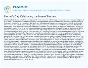 This essay explores the cultural and social impact of Mother's Day, examining its evolution, the way it has been commercialized, and the counter-arguments that challenge its modern-day significance. By delving into these aspects, we aim to understand the multifaceted nature of this widely celebrated occasion.