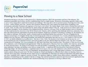In conclusion, moving to a new place, whether it be a city or a school, is an integral part of life's journey. It is a process that tests our resilience and adaptability, but it also offers opportunities for growth and transformation. My journey from Austin to Houston, and ultimately to Tyler, has shaped who I am today. Through these experiences, I have learned that with an open heart and a positive mindset, the challenges of moving can lead to a rewarding and enriching life adventure.