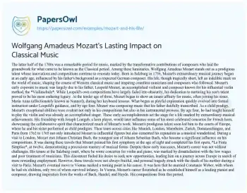 Wolfgang Amadeus Mozart’s Lasting Impact on Classical Music. (2019, Dec 06). Retrieved from https://hub.papersowl.com/examples/mozart-and-his-life/