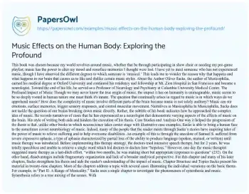 One way it helped the progression of the thesis is that, unlike other books in which neuroscience takes center stage with illustrative case examples, Sacks is able to bring a human face to the sometimes covert neurobiology of music. Indeed, many of the people that the reader meets through Sacks’s stories have inspiring tales of the power of music to relieve suffering and to help overcome disabilities. An example of this is through the anecdote of Samuel S. suffered from severe expressive aphasia, a type of aphasia characterized by partial loss of the ability to produce language (spoken, manual, or written) until music therapy was introduced. Before implementing this therapy strategy, the doctors tried intensive speech therapy, but for 2 years, he was totally speechless and unable to retrieve a single word which led doctors to declare him “hopeless.” However, one day the music therapist suggested music therapy as a last-ditch effort, “within two months, he was making short but appropriate responses to questions” (232). On the other hand, disadvantages include fragmentary organization and lack of a broader analytical perspective. For this chapter and many of his later chapters, Sacks strengthens his thesis and aids the reader's understanding of the impact of music.