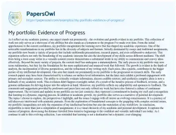 Beyond academic prowess, myportfolio narrates a tale of personal growth. The chosen topics, highlighted perspectives, and engagement with societal issues mirror an evolving consciousness. It is a visual narrative of my maturation, intertwining academic pursuits with self-discovery. In essence, Myportfolio is more than a compilation; it is a living document that mirrors my educational and personal journey, reminding me that learning is an ongoing expedition rather than a static destination. Moreover, at PapersOwl, there are additional free essay samples connected to Evidence.