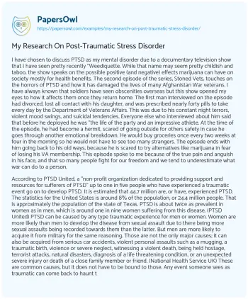 My Research On Post-Traumatic Stress Disorder. (2019, Jul 10). Retrieved from https://hub.papersowl.com/examples/my-research-on-post-traumatic-stress-disorder/