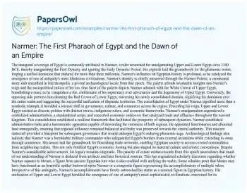 Narmer: The First Pharaoh of Egypt and the Dawn of an Empire. (2024, May 12). Retrieved from https://hub.papersowl.com/examples/narmer-the-first-pharaoh-of-egypt-and-the-dawn-of-an-empire/