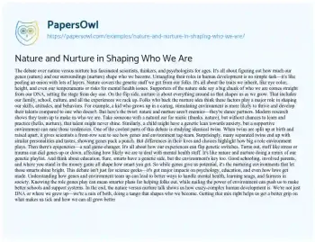 This essay about the nature versus nurture debate explores the complex interaction between genetics (nature) and environment (nurture) in shaping human development. It explains how genetic predispositions influence physical and psychological traits while emphasizing the crucial role of environmental factors such as family, education, and culture. The essay highlights studies on identical twins to illustrate the interplay between nature and nurture and introduces epigenetics, showing how experiences can modify gene expression. It also discusses the implications for fields like psychology and education, suggesting that understanding this balance can lead to more effective interventions and support systems.