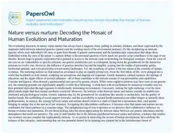 Nature versus nurture: Decoding the Mosaic of Human Evolution and Maturation. (2023, Dec 01). Retrieved from https://hub.papersowl.com/examples/nature-versus-nurture-decoding-the-mosaic-of-human-evolution-and-maturation/