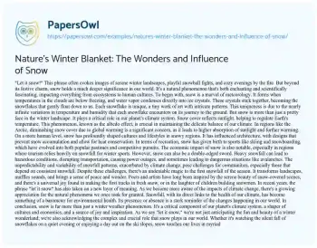 This essay delves into the multifaceted nature of snow, exploring its scientific formation, cultural impact, and dual role as both a source of beauty and a challenge. It begins by explaining the meteorological process behind snow’s formation, highlighting the unique and intricate structure of each snowflake. The piece then examines snow’s critical role in Earth’s climate system, particularly through the albedo effect, and its significance in regulating global temperatures. Moving beyond the science, the essay reflects on how snow has shaped human cultures, influencing architecture, sports, and economies, especially in regions where winter tourism is vital. The essay also acknowledges the challenges posed by heavy snowfall, from transportation disruptions to dangerous conditions like avalanches. Finally, it touches on the symbolic meaning of snow in the context of climate change, underscoring a growing appreciation for this natural phenomenon and its connection to environmental health. Overall, the essay presents snow as more than just a winter occurrence; it’s a crucial element in nature’s cycle, enriching human life and reminding us of our planet’s delicate balance. On PapersOwl, there’s also a selection of free essay templates associated with Nature.
