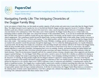 This essay delves into the intriguing landscape of the Duggar Family Blog, a digital platform chronicling the lives of Jim Bob and Michelle Duggar and their 19 children. Offering a distinctive window into a lifestyle intertwined with conservative values, deep-rooted faith, and the challenges of managing a large family, the blog becomes a virtual journal inviting readers to share in the joys, trials, and significant moments of this extraordinary family. The exploration extends beyond the seemingly idyllic portrayal, addressing controversies arising from their adherence to conservative principles and the family’s navigation of public scrutiny. The essay emphasizes the blog’s role as both a narrative canvas for family life and a community-building platform, creating a space where readers are not just spectators but active participants in the ongoing Duggar family story. Moreover, at PapersOwl, there are additional free essay samples connected to Blog.