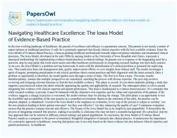 This essay delves into the Iowa Model of Evidence-Based Practice, a pivotal framework in modern healthcare for integrating research findings into clinical practices. Originating from the University of Iowa Hospitals and Clinics, this model provides a systematic, step-by-step guide to improving patient care by merging clinical expertise with the best available evidence. The essay outlines the model’s process, beginning with the identification of clinical problems or improvement opportunities and the formation of a multidisciplinary team. It emphasizes the critical role of reviewing and critiquing relevant literature to inform practice changes. Furthermore, the essay underscores the importance of balancing research evidence with clinical expertise and patient preferences, highlighting the pilot testing phase for new practices. Continuous evaluation is presented as a key component, ensuring the relevancy and effectiveness of implemented practices. The essay concludes by praising the simplicity and adaptability of the Iowa Model, showcasing its significance in guiding healthcare professionals towards evidence-based, patient-centered care. At PapersOwl, you’ll also come across free essay samples that pertain to Healthcare.