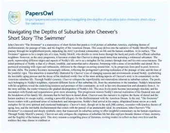 This essay delves into John Cheever’s celebrated short story “The Swimmer,” a poignant narrative that offers a critical exploration of suburban America and the human condition. It examines the journey of the protagonist, Neddy Merrill, who embarks on an unusual adventure swimming through neighborhood pools, symbolizing different stages of his life. The essay highlights how Cheever skillfully uses this surreal journey to comment on themes such as disillusionment, the passage of time, and the fragility of the American Dream. It discusses the portrayal of Neddy as a character initially full of vigor and denial, who gradually confronts the stark realities of aging, financial ruin, and familial breakdown. Through this analysis, the essay emphasizes Cheever’s critique of the superficiality and materialism of suburban life, and the inherent human tendency to escape from reality. Concluding with Neddy’s arrival at his desolate home, the essay encapsulates the story’s enduring relevance and its profound commentary on life, aging, and the pursuit of unattainable ideals. PapersOwl showcases more free essays that are examples of Short Story.