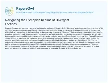 This essay delves into the intriguing world of “Divergent Factions” within the context of dystopian literature. Exploring the complexities of a society divided into distinct groups based on personality traits, the essay offers a comprehensive analysis of how this dystopian setting shapes characters, drives the narrative, and reflects broader societal themes. With a keen focus on the factions’ significance in the story, the essay provides insights into the consequences of conformity and the human desire for individuality. It examines the tension between societal structure and personal identity, shedding light on the moral dilemmas faced by the characters. Ultimately, this essay offers readers a thought-provoking exploration of the dystopian elements within “Divergent Factions,” uncovering the underlying messages and societal reflections embedded in this captivating narrative. PapersOwl offers a variety of free essay examples on the topic of Dystopia.