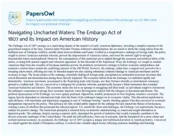 Navigating Uncharted Waters: The Embargo Act of 1807 and its Impact on American History. (2024, Jan 26). Retrieved from https://hub.papersowl.com/examples/navigating-uncharted-waters-the-embargo-act-of-1807-and-its-impact-on-american-history/