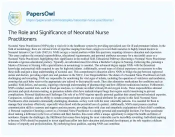 Neonatal Nurse Practitioners (NNPs) play a vital role in the healthcare system by providing specialized care for ill and premature infants. In the field of neonatology, there are various levels of expertise ranging from basic caregivers in newborn nurseries to highly trained doctors in Neonatal Intensive Care Units (NICUs). NNPs occupy a crucial position within this spectrum, requiring extensive education and experience. This essay explores the essential responsibilities, educational requirements, and personal attributes necessary for a successful career as a Neonatal Nurse Practitioner, highlighting their significance in the medical field.