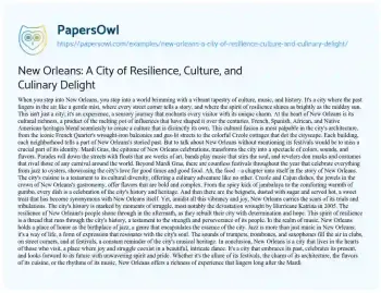 This essay about New Orleans portrays it as a city alive with culture, history, and a deep sense of resilience. It emphasizes how the city’s diverse cultural heritage, influenced by French, Spanish, African, and Native American roots, is visible in its vibrant architecture, festivals, and culinary traditions. The essay vividly describes the city’s most iconic celebrations, like Mardi Gras and Jazz Fest, as core expressions of New Orleans’ spirit and community bonding. Furthermore, it delves into the city’s culinary scene, presenting it as a reflection of its cultural melting pot, where dishes like gumbo and jambalaya tell the story of its rich history. Despite the hardships faced, particularly during Hurricane Katrina, New Orleans is depicted as a city that embodies perseverance and strength, with its people’s commitment to rebuild and maintain their unique cultural identity. The essence of New Orleans, as captured in the essay, is its ability to blend joy and adversity, creating a unique and enduring legacy celebrated through its music, food, and festivals. At PapersOwl, you’ll also come across free essay samples that pertain to New Orleans.