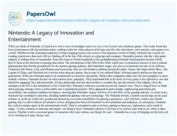 This essay about Nintendo outlines the company’s significant impact on the entertainment and gaming industry, tracing its evolution from a playing card manufacturer to a video game industry titan. It highlights how Nintendo set itself apart through a focus on creativity, engaging gameplay, and iconic characters, which have become cultural touchstones across generations. By emphasizing innovation over chasing trends, Nintendo has consistently delivered memorable gaming experiences, from the NES to the Nintendo Switch. The essay also touches on Nintendo’s influence on game design and its ability to adapt to new technologies and platforms, such as mobile gaming. Overall, the piece conveys Nintendo’s enduring legacy and its role in shaping gaming into a mainstream form of entertainment, inviting players of all ages to explore, play, and dream. Also at PapersOwl you can find more free essay examples related to Nintendo.