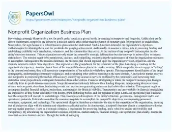 This essay about creating a business plan for a nonprofit organization outlines the essential components and considerations necessary for success. It emphasizes the importance of a clear mission statement to guide strategic planning and communicate purpose. The essay discusses the need for a market analysis to understand the operational landscape and identify community needs. It highlights the significance of financial planning, focusing on diverse revenue streams and the necessity for transparency to build trust with donors and the public. Additionally, it details the operational plan, including the organization’s structure, governance, and resources needed to achieve its goals. Overall, the essay presents the nonprofit business plan as a multifaceted tool for strategic guidance, funding acquisition, and ensuring accountability and sustainability.
