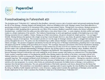 This essay will analyze examples of foreshadowing in Ray Bradbury’s “Fahrenheit 451.” It will examine key instances in the narrative where Bradbury hints at future events, discussing how these moments build suspense and thematic depth. The essay will explore how foreshadowing is used to underscore the novel’s critique of censorship, the loss of individual thought, and the dangers of a conformist society. It will also consider how Bradbury’s use of foreshadowing reflects his broader literary style and contributes to the novel’s enduring impact. At PapersOwl, you’ll also come across free essay samples that pertain to Fahrenheit 451.