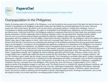 Manila, the bustling capital of the Republic of the Philippines, is not only the political and economic heart of the nation but also the densest city on Earth. Overpopulation in the Philippines, particularly in urban areas like Manila, has profound implications for the nation. This essay explores the causes of this density, the effects on the city and country, and potential solutions to mitigate these challenges.