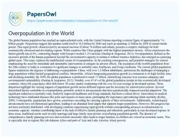 2% increase (Dunlap & Jorgenson, 2012). Overpopulation, defined as the excessive growth of the human population beyond the environment's capacity to sustain it without resource depletion, has emerged as a pressing global issue. This essay explores the multifaceted causes of overpopulation, its far-reaching consequences, and potential strategies for control, emphasizing the need for immediate and sustainable interventions to mitigate its adverse effects.