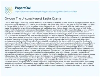 This essay about oxygen presents it not merely as a chemical element, but as the lifeblood of our planet, essential for the survival of all living beings. It discusses oxygen’s role in various vital processes such as respiration, the formation of water, and protection against UV radiation via the ozone layer. Highlighting the significance of photosynthesis, the essay credits plants, algae, and certain bacteria as primary producers of oxygen, emphasizing the importance of forests and oceans in this process. Moreover, it touches on the industrial and medical applications of oxygen, showcasing its versatility. The essay also raises concerns about how human activities like pollution, deforestation, and climate change threaten the balance of oxygen production and consumption, underlining the need for sustainable practices to protect this invaluable resource. Moreover, at PapersOwl, there are additional free essay samples connected to Oxygen.