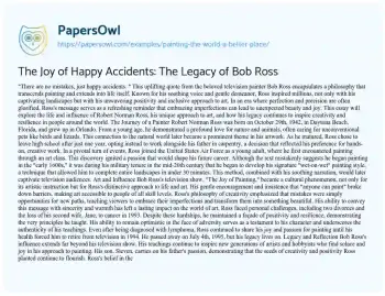 The Joy of Happy Accidents: The Legacy of Bob Ross. (2021, Jul 06). Retrieved from https://hub.papersowl.com/examples/painting-the-world-a-better-place/
