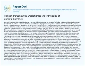 This essay about “Paisaen Perspectives: Deciphering the Intricacies of Cultural Currency” explores the nuanced exchanges shaping societies worldwide. From the vibrant tapestry of cultural practices to the complexities of power dynamics and appropriation, it into how cultural currency bridges diverse worlds. Through empathy and collaboration, it advocates for a more inclusive approach to valuing and preserving cultural identity, envisioning a world where mutual respect fosters empathy and equity for all.