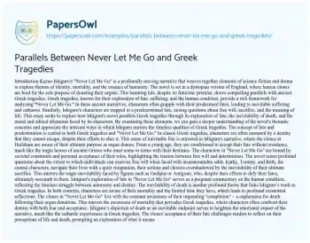 " In these ancient narratives, characters often grapple with their predestined fates, leading to inevitable suffering and catharsis. Similarly, Ishiguro's characters are trapped in a predetermined fate, raising questions about free will, sacrifice, and the meaning of life. This essay seeks to explore how Ishiguro's novel parallels Greek tragedies through its exploration of fate, the inevitability of death, and the moral and ethical dilemmas faced by its characters. By examining these elements, we can gain a deeper understanding of the novel's thematic concerns and appreciate the intricate ways in which Ishiguro mirrors the timeless qualities of Greek tragedies.