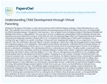 This essay offers a reflective analysis of different parenting styles through the experience of raising a virtual child. It will explore how various approaches to parenting – authoritative, authoritarian, permissive, and uninvolved – impact a child’s development, drawing parallels with real-life parenting scenarios. The piece aims to provide insights into the effectiveness and consequences of different parenting methods, using the virtual child-rearing experience as a practical case study. Additionally, PapersOwl presents more free essays samples linked to Child.