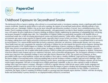 Childhood Exposure to Secondhand Smoke. (2019, Mar 23). Retrieved from https://hub.papersowl.com/examples/passive-smoking-and-childrens-health/