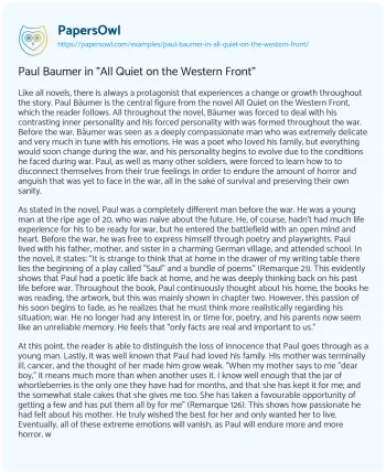 Paul Baumer in "All Quiet on the Western Front". (2020, Mar 23). Retrieved from https://hub.papersowl.com/examples/paul-baumer-in-all-quiet-on-the-western-front/