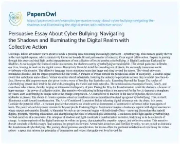 Persuasive Essay About Cyber Bullying: Navigating the Shadows and Illuminating the Digital Realm with Collective Action. (2023, Sep 15). Retrieved from https://hub.papersowl.com/examples/persuasive-essay-about-cyber-bullying-navigating-the-shadows-and-illuminating-the-digital-realm-with-collective-action/