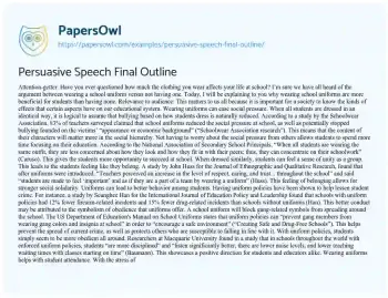 This essay will outline the key components of a final persuasive speech. It will discuss how to structure the speech effectively, including the introduction, body, and conclusion, and techniques for persuading the audience. The piece will offer tips on delivering a compelling argument, using evidence, and engaging the audience. Moreover, at PapersOwl, there are additional free essay samples connected to School Uniforms.