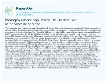 An essay on “The Sword in the Stone” could delve into its timeless significance as a legendary tale rooted in Arthurian folklore. It would explore the symbolic elements within the narrative, highlighting its themes of destiny, valor, and the emergence of an unlikely hero. The essay might dissect the allegorical layers embedded in the story, showcasing how Arthur’s journey from obscurity to kingship embodies universal motifs of fate and inner nobility. Additionally, it could discuss the tale’s broader implications, including its reflections on leadership, governance, and the enduring allure of myth in shaping cultural narratives. Ultimately, the essay would paint a vivid picture of the story’s timeless resonance and its capacity to inspire introspection about destiny, courage, and the latent potential within every individual. More free essay examples are accessible at PapersOwl about Philosophy.