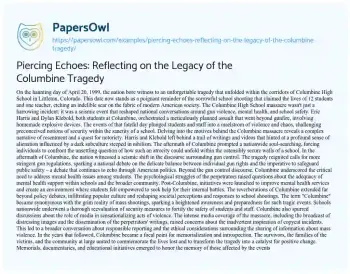 This essay about reflects on the significant impact of the Columbine High School massacre on April 20, 1999, which had a profound influence on American discussions surrounding gun violence, mental health, and school safety. The narrative recounts the carefully planned attack carried out by students Eric Harris and Dylan Klebold, and it explores the aftermath that led to a nationwide reconsideration of gun control policies and the urgent need to address mental health issues among students. The essay investigates how the repercussions of Columbine went beyond policy debates, shaping popular culture and altering societal perspectives on school shootings. It highlights the tragedy’s role in initiating conversations about responsible media reporting and ethical considerations in sharing information about mass violence. The narrative concludes by underscoring how Columbine has become a symbol for memorialization and positive change, bringing together survivors, families, and communities in the pursuit of safer schools and a future free from such tragic events. Also at PapersOwl you can find more free essay examples related to Legacy.