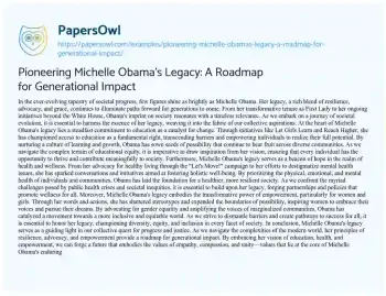 Pioneering Michelle Obama's Legacy: A Roadmap for Generational Impact. (2024, Mar 18). Retrieved from https://hub.papersowl.com/examples/pioneering-michelle-obamas-legacy-a-roadmap-for-generational-impact/