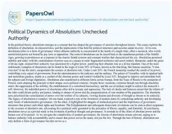 This essay about the politics of absolutism examines the concept’s definition, characteristics, and historical significance. Absolutism, epitomized by the unchecked authority of monarchs like Louis XIV, centralized power in the hands of a single ruler. It explores how absolutist regimes operated, using examples from European history to illustrate their methods of governance. Despite promises of stability, absolutism often led to tyranny and oppression, as rulers wielded power without constraint. The essay discusses the legacy of absolutism, acknowledging its role in shaping modern states while also highlighting its dangers and the lessons it offers about the balance of power and the importance of accountability in governance. PapersOwl offers a variety of free essay examples on the topic of Politics.