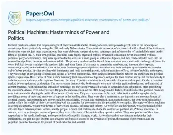 This essay offers a comprehensive exploration of the concept of political machines, prominent in American politics during the 19th and early 20th centuries. It delves into their structure and operation, highlighting how these entities, led by influential bosses, exerted significant control over local politics, business, and society. The post examines the dual nature of political machines, acknowledging their role in providing stability and support in rapidly growing urban areas, while also critiquing the corruption and exploitation inherent in their operations. Reflecting on the legacy of political machines, the essay contemplates their complex impact, recognizing their contribution to governance and their capacity for ethical breaches. This nuanced discussion provides insights into the dynamics of power and governance, shedding light on the intricate relationship between political leaders, communities, and the mechanisms of control and support. More free essay examples are accessible at PapersOwl about Politics.