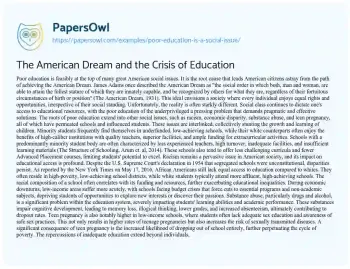 The American Dream and the Crisis of Education. (2019, Jun 08). Retrieved from https://hub.papersowl.com/examples/poor-education-is-a-social-issue/