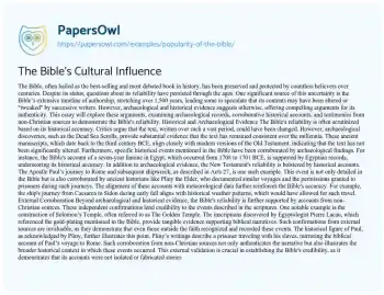 The Bible's Cultural Influence. (2019, Mar 15). Retrieved from https://hub.papersowl.com/examples/popularity-of-the-bible/