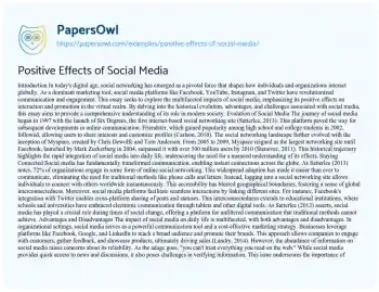 This essay will highlight the positive impacts of social media, such as connectivity, community building, information sharing, and the support of social causes and businesses. PapersOwl showcases more free essays that are examples of Communication.