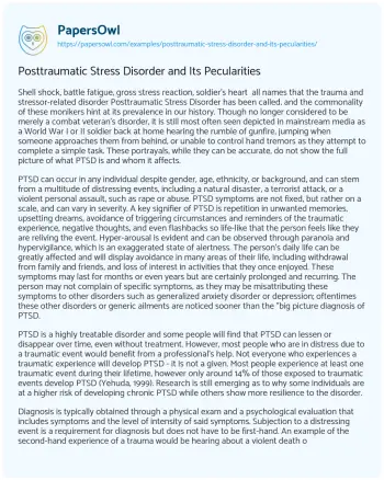 Posttraumatic Stress Disorder and Its Pecularities. (2020, Feb 12). Retrieved from https://hub.papersowl.com/examples/posttraumatic-stress-disorder-and-its-pecularities/