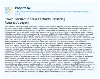 Order now Yet, as civilizations burgeon and communities coalesce, the specter of inequality emerges, necessitating the formation of social contracts to regulate human relations and safeguard communal interests. Within this framework, Rousseau discerns a delicate dance of power dynamics that shape the contours of societal order.