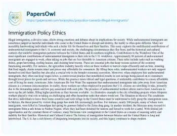 Focusing on the societal attitudes, this essay dissects the underlying reasons for prejudice against illegal immigrants. It looks at the socio-political climate, media portrayal, and general misconceptions that contribute to these biases. On PapersOwl, there’s also a selection of free essay templates associated with Illegal Immigration topic.