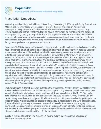 In reading the articles 'Nonmedical Prescription Drug Use Among US Young Adults by Educational Attainment,' 'Ethnic/Racial Differences in Peer and Parent Influence on Adolescent Prescription Drug Misuse,' and 'Influences of Motivational Contexts on Prescription Drug Misuse and Related Drug Problems', they all highlight the misuse of prescription drug use by young adults. Each article provides its unique interpretation of studies concerning how and why youth misuse prescription drugs on an ethnic level. The articles also discuss the risks of prescription drug misuse, treatments for affected youth, and preventative measures.