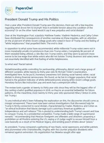 President Donald Trump and His Politics. (2019, Dec 30). Retrieved from https://hub.papersowl.com/examples/president-donald-trump-and-his-politics/