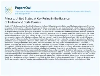 Printz v. United States: A Key Ruling in the Balance of Federal and State Powers. (2024, May 21). Retrieved from https://hub.papersowl.com/examples/printz-v-united-states-a-key-ruling-in-the-balance-of-federal-and-state-powers/
