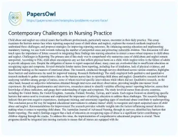 Child abuse and neglect are critical issues that healthcare professionals, particularly nurses, encounter in their daily practice. This essay examines the barriers nurses face when reporting suspected cases of child abuse and neglect, explores the research methods employed to understand these challenges, and proposes strategies for improving reporting outcomes. By enhancing nursing education and implementing mandatory training, we can work towards reducing the number of unreported cases and protecting vulnerable children. This discussion will also touch upon the importance of future research in integrating these findings into nursing education to ensure a more robust response to child abuse and neglect.