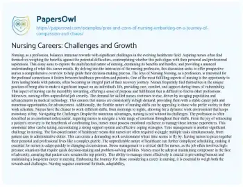 Nursing Careers: Challenges and Growth. (2023, Sep 14). Retrieved from https://hub.papersowl.com/examples/pros-and-cons-of-nursing-embarking-on-a-journey-of-compassion-and-chaos/