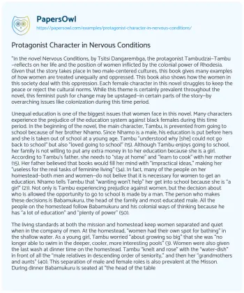 "In the novel Nervous Conditions, by Tsitsi Dangarembga, the protagonist Tambudzai—Tambu—reflects on her life and the position of women inflicted by the colonial power of Rhodesia. Given that the story takes place in two male-centered cultures, this book gives many examples of how women are treated unequally and oppressed. This book also shows how the women in this society deal with this oppression. Each female character in this novel struggles to keep the peace or reject the cultural norms.
