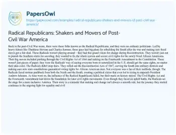 This essay uncovers the dynamic role played by figures like Thaddeus Stevens and Charles Sumner, the Radical Republicans, in the Reconstruction period. Delving into their ambitious vision for justice and equality, the essay explores key legislative milestones such as the Civil Rights Act of 1866 and the Fourteenth Amendment. Amidst political turmoil and opposition, the Radicals sought to reshape the South and secure civil rights for freed African Americans. Their enduring legacy, though facing challenges, left an indelible mark on the ongoing journey towards equality and civil rights in the United States. PapersOwl offers a variety of free essay examples on the topic of Civil War.