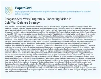 Reagan's Star Wars Program: A Pioneering Vision in Cold War Defense Strategy. (2023, Dec 01). Retrieved from https://hub.papersowl.com/examples/reagans-star-wars-program-a-pioneering-vision-in-cold-war-defense-strategy/